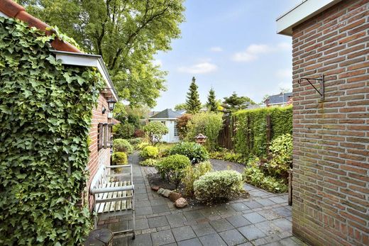 Er is geen oprit, maar je kunt wel met de fiets etc. langs het huis naar de tuin lopen. Direct achter de tuinpoort staat een fietsenschuur, achterin de tuin staat een blokhut. De tuin is keurig aangelegd met een mooie mix van beplanting en bestrating, het is dan ook fijn vertoeven op één van de terrasjes.