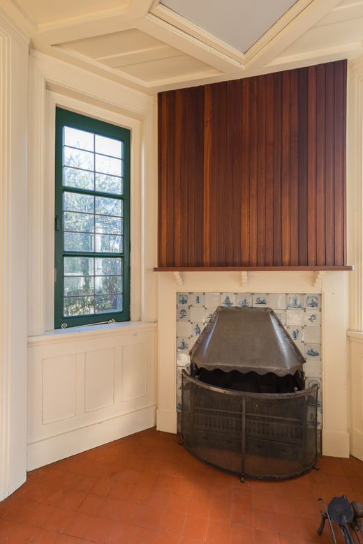 De royale kamer-en-suite strekt zich uit over de gehele breedte van het huis. Door de suitedeuren is deze mooie ruimte in 2 vertrekken te verdelen. Daarom zijn er ook 2 deuren naar de hal, 2 deuren naar de tuin èn 2 haarden. De schouw in het linkerdeel zit in een kleine erker. De andere schouw in het rechterdeel is op de foto niet te zien want deze zit “verstopt” achter de boekenkast.
