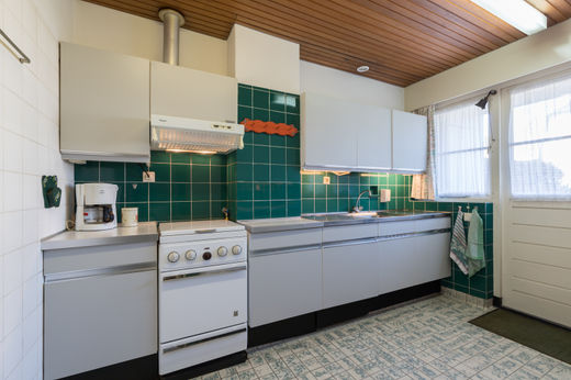 Rechts van de hal is de keuken met daarin een deur naar buiten en de deur naar de grote kelder. Het keukenblok is erg eenvoudig maar de ruimte is prima. In de kelder kun je een grote voorraad eten en drinken kwijt, ook is hier de CV-ketel geinstalleerd.